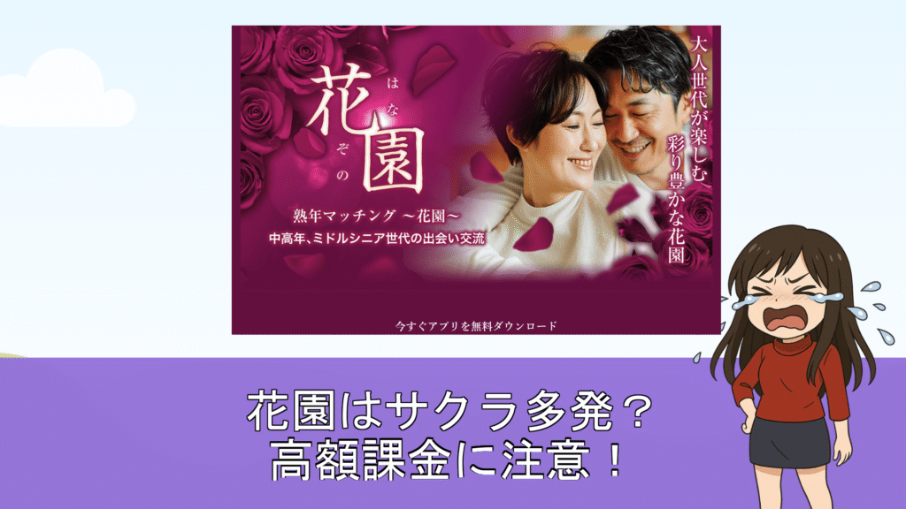 りんかです。あなたの不安、いまスッキリさせます。 今回は中高年向けマッチング「花園」を対象に、実情をたしかめます。 公式サイトは恋活・婚活・再婚活まで対応、24時間監視とサポートを強調する出会い系サービスです。 「恋も遊びも『花園』で」「安心... -
